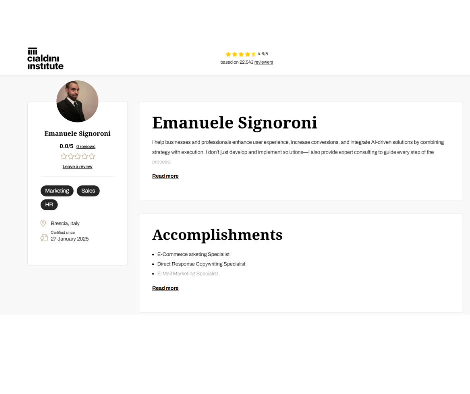 Questa pagina è strutturata appositamente per te che in passato ci siamo sentiti per una la realizzazione del tuo sito web. Come ben sai le recensioni, casi studio e le testimonianze sono l'anima delle conversioni e, anche se, come vedrai dal mio prtofolio i casi studio non mi mancano, ho il desiderio di associare a quei casi studio delle recensioni e delle testimonianze. Sopratutto adesso che sono divenuto UFFICIALMENTE l'unico partner italiano di Robert Cialdini (del Cialdini Institute) e a breve sarò partner della EVO Business School.